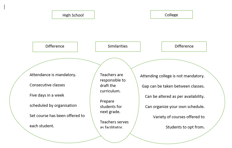 Compare and contrast essays can be crafted in a form of a Venn diagram, or to discuss pointers one by one, or to go subject-wise. For better understanding, here is an example of the Venn Diagram. The topic is Comparing high school v/s College.