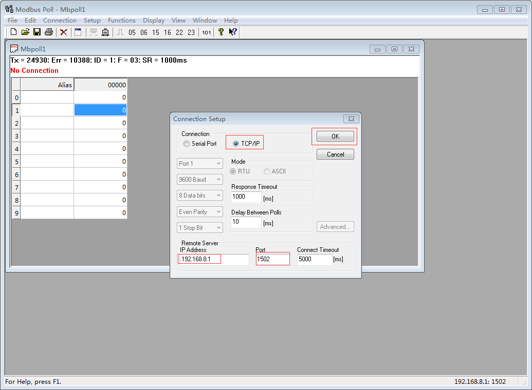 7.   192.168.8.1 is router LAN IP in this case. If you want to access it via cell interface, then it shall be cell IP address. The Port is same value as TCP port at router Modbus configure page.