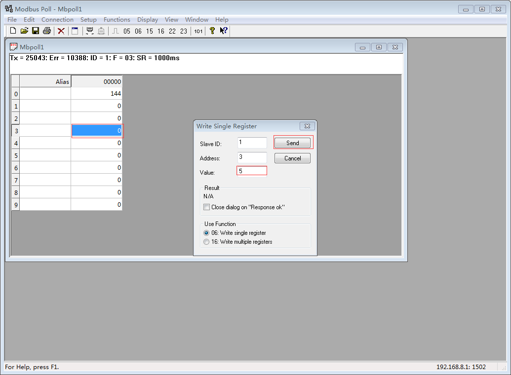 11. Double click Grid at Modbus Poll, set single Register value as 5.