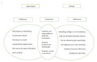 Compare and contrast essays can be crafted in a form of a Venn diagram, or to discuss pointers one by one, or to go subject-wise. For better understanding, here is an example of the Venn Diagram. The topic is Comparing high school v/s College.